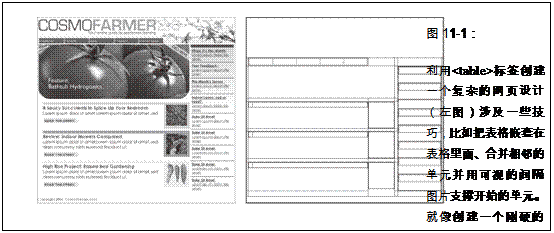 HTML的局限性迫使設計師們去開發更聰明的方式來使他們的網頁更美觀。過去最常用的工具是<table>標簽,它本是用來創建電子數據表――比如由數據行和列組成的信息顯示表。但是設計師們卻用HTML的表格來創建一種用來組織網頁內容的腳手架(見圖11-1)。可是由於<table>標簽本來不是要用於布局的,因此設計師們不得不經常以各種不尋常的方式來使用這個標簽――比如把一個表格放在另一個表格的單元裡面――僅僅為了得到他們想要的效果。這種方法的工作量很大,增加了大量額外的HTML代碼,並使得後面要修改設計很難。但是在CSS出現之前,那就是網頁設計師們所擁有的一切辦法。
