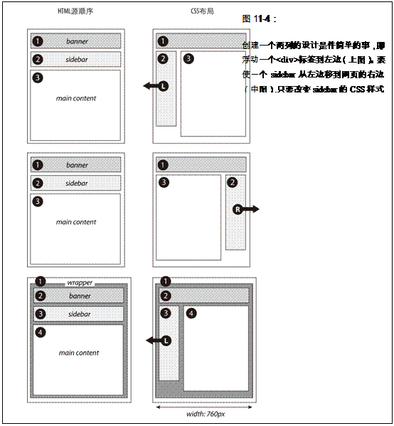 圖11-4展示了3個兩列的設計。左邊的圖表展示了網頁HTML的源順序:給banner的一個<div>,後面跟著sidebar的<div>,最後是main content的<div>。在右邊,你可以看到實際的網頁布局。在HTML中sidebar在main content前面,因此它可以浮動到左邊(上圖,下圖)或者右邊(中圖)。