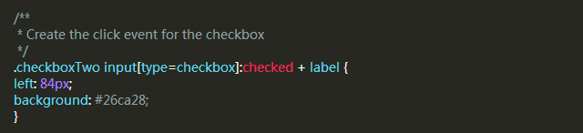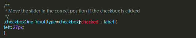 現在這個滑塊在選中(關閉)位置,當我們選中復選框,我們希望有一個反應發生,所以我們可以移動滑塊到另一端。我們需要知道,判斷復選框被選中,如果是則改變label元素的left屬性。