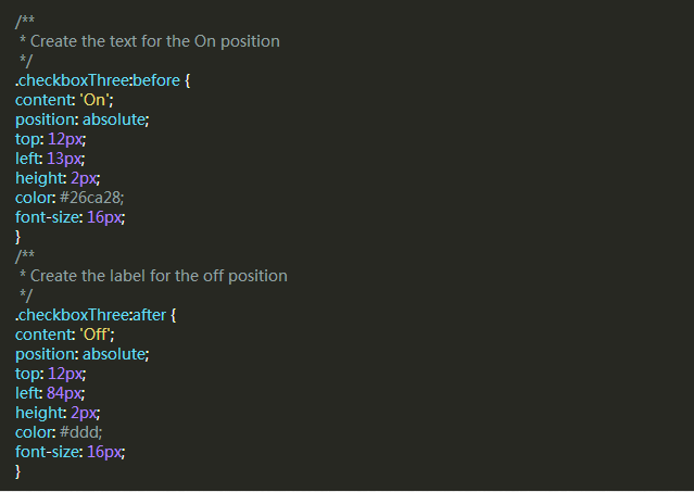 但是元素數量不足以讓我們實現這些功能,所以我們要用:before和:after兩個偽類創建兩個元素,分別放置”ON”和”OFF”。