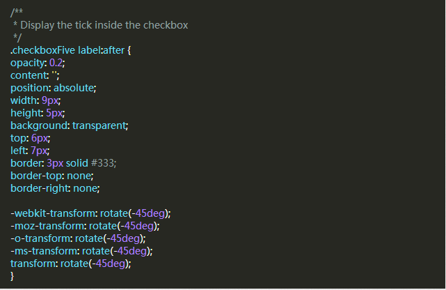 接下來,我們要創建方框中的對勾,對於這一點,我們可以使用:after偽類創建一個新的元素,為了實現這個樣式,我們可以創建一個5px x 9px的長方形並給他加上邊框。這時候我們去掉上面和右邊的邊框之後,它會看起來像一個字母L。然後我們可以使用CSS的transform屬性讓它旋轉一下,這樣看起來就像是一個對勾。
