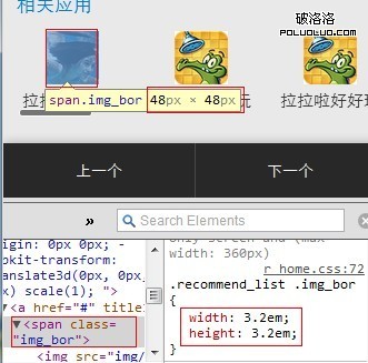 從上面的兩張實例圖我們可以看到,同一個元素,寬高為3.2em*3.2em,在360px分辨率下,因為基准字號為15px,故解析出來的實際尺寸為48px*48px,而在480px分辨率下,基准字號為20px,故實際的尺寸為64px*64px。