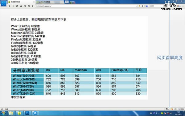 Win7下是574。在window XP常見分辨率1440×900下我們除掉任務欄,浏覽器菜單欄以及狀態欄後剩下的網頁首屏高度平均值是716。Win7下是706。