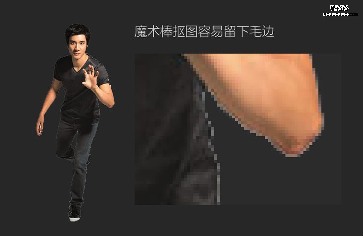 猜測設計人員做的時候應該是用的魔術棒摳圖的。魔術棒雖然好用摳圖很快,但是魔術棒摳出來的容易留下毛邊。