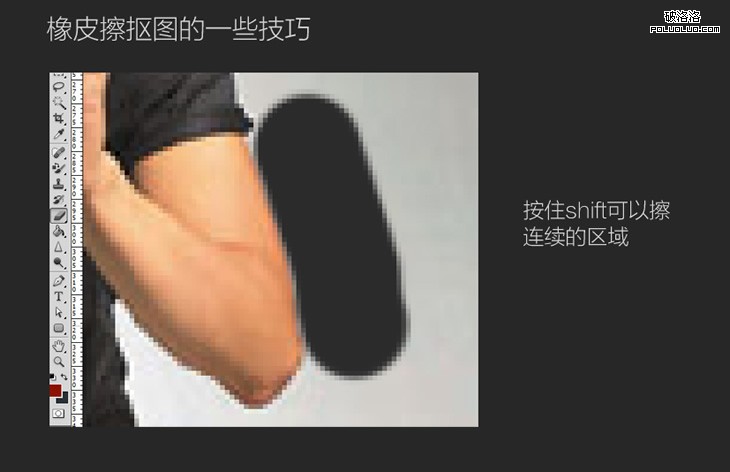 橡皮擦摳圖:按住SHIFT可以擦一條直線的區域,配合快速蒙版擦角落