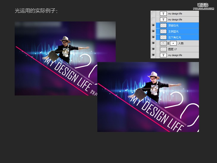 在頁面中人物左側的黃色高光部分跟頁面左上角撒下的光輝對應,造成真實的融入感