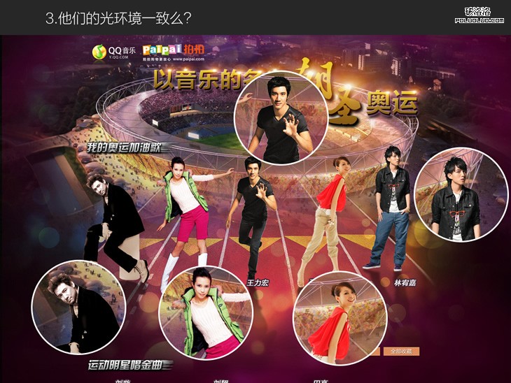 最左邊張學友臉色發白皮膚呈棕色。左邊第二個莫文蔚應該是在室內拍的照片,皮膚呈暖色光源在頂部。中間的王力宏光源在右側,並且用交明顯的陰影,猜測在室外拍的照片。右邊第二個張靓穎她的照片光源在左側暖色調。最右邊變林宥嘉照片光源在左側。