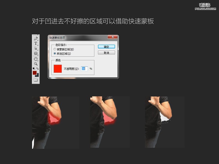 對於對於凹進去不好擦的區域可以借助快速蒙板來擦除。