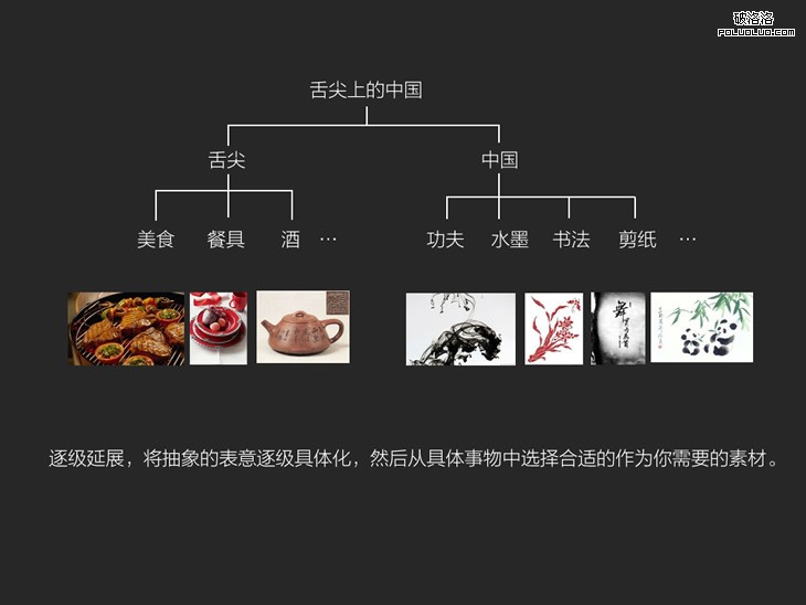 我們先將“舌尖上的中國”提取關鍵字“舌尖”、“中國”。舌尖讓我們聯想到什麼呢?有美食、餐具、,等等。中國讓我們聯想到什麼呢?功夫、水墨、剪紙、龍、國畫,等等。