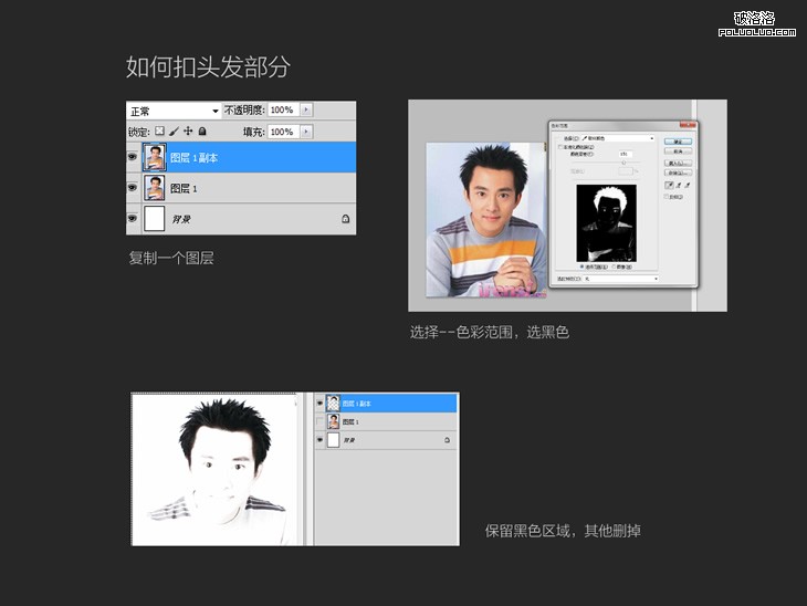 復制一個圖層,然後選擇–色彩范圍,選頭發的黑色顏色容差調到150左右。點確定