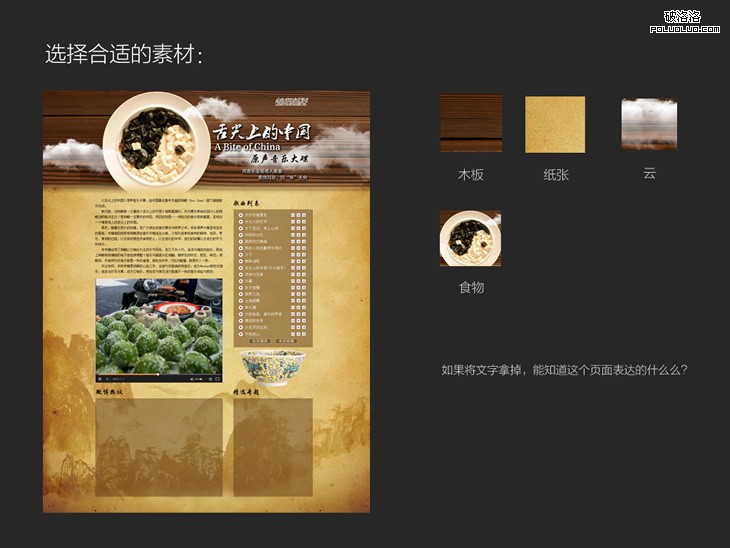 分析下這個頁面的選材。木板、紙張、雲、以及食物對主題氛圍的烘托也顯得有些不足。