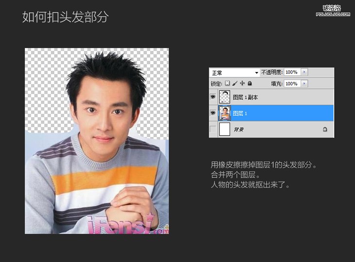 用橡皮擦擦掉圖層1的頭發部分。合並兩個圖層。人物的頭發就摳出來了。