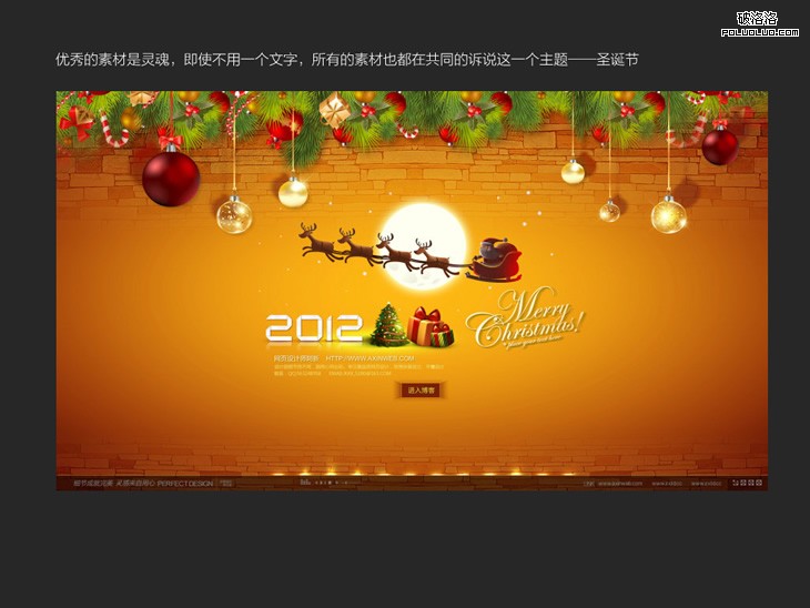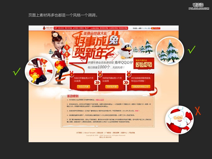 如果這個時候頁面加進來一個右下角那個聖誕老人呢?這個聖誕老人的質感過於卡通,過於平面化,跟頁面的其他素材質感嚴重不符。所以選素材的時候應該回避這類素材。
