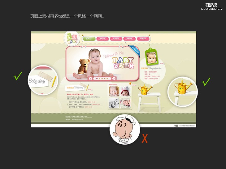 再來看這個頁面。這個頁面中板凳,油漆桶文具都是很寫實的素材,在這個頁面裡素材的質感統一為寫實類。所以像下面那個卡通babe的素材是不適合的。