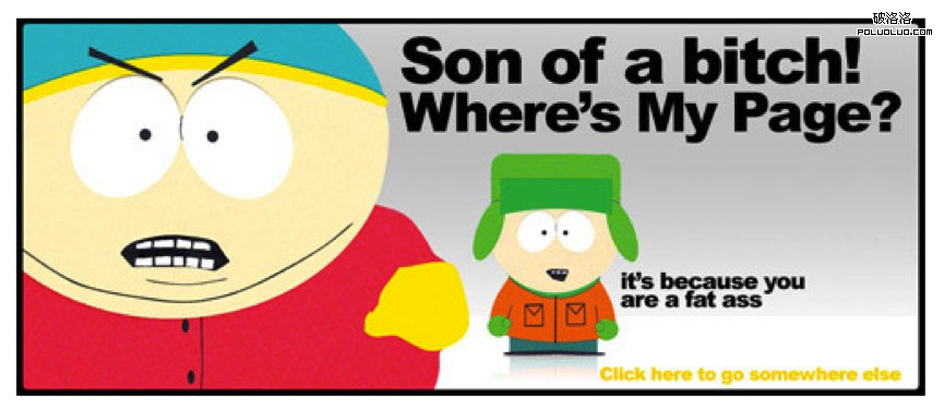 美國動畫片南方公園的網站,在404上依舊采用了無厘頭的風格,Kyle和胖子Eric以對話的形式告知用戶頁面不存在,延續惡搞風格。