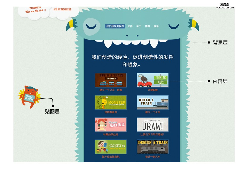 頁面上很多的元素在相互獨立地滾動著,如果我們來對其它分層的話,可以有兩到三層 :背景層,內容層,貼圖層