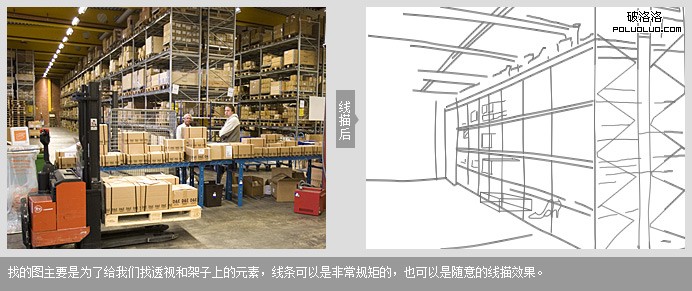 線描的方式是我比較常用的形式,這種形式相對簡單,很容易上手,效果也比較有張力。先找一個相對合適的場景,對著現實的場景勾出想要的線條,再對線條進行粗細、顏色的調整。舉個例子如下: