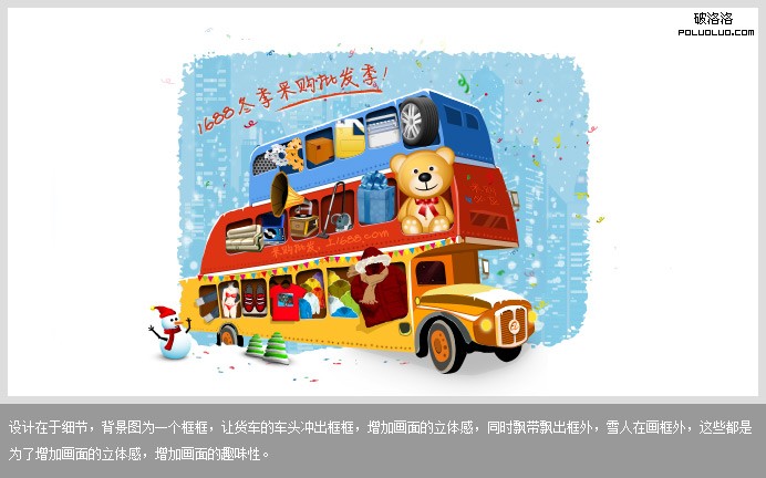 誇張的手法我們見的非常多,以現實實物為藍本,用誇張的手法來表現實物,使之更具表現力。以此來吸引用戶的目光。下面例子為冬季采購的banner設計。