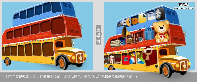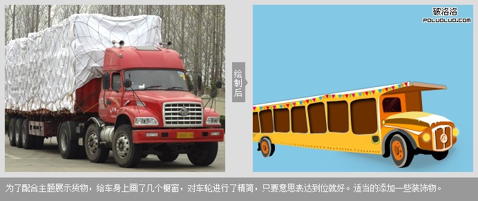 3.一層的貨車被誇張繪制成三層之後,增加了貨車的表現力,同時增加了貨車的趣味性。後面只需要添加一些輔助性的元素,加強主題所需的氛圍即可,最終效果如下。