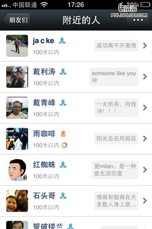 點擊微信標簽欄上的“找朋友”,再選中“附近的人”,才能到達如下圖的列表頁面。但很明顯,微信的頭像比陌陌的小很多,信息也不如陌陌豐富。如果你只是單純的想結交陌生人,會選擇哪個應用?