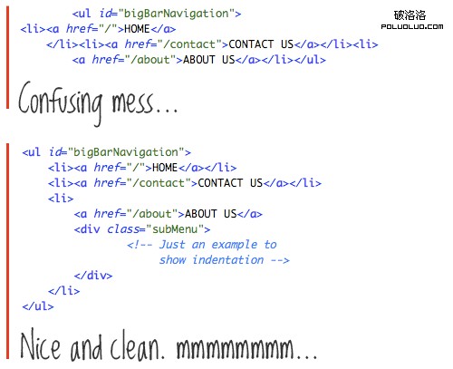 不用說,大家都喜歡下面的那種代碼吧。這只是一個人的習慣問題,不過建議從開始做好,利人利已。有關於這方面的介紹,大家還可以參考:Clean up your Web pages with HTML TIDY。