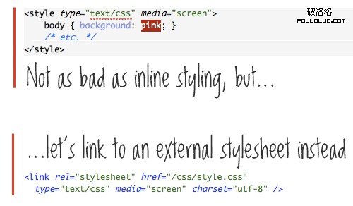 上面我們所說的只是樣式,其實javascript腳本也和CSS樣式是同一樣的道理。圖文並說,我最終想表達的意思是“在制作web頁面中,盡量將你的CSS樣式和javascript腳本單獨放在一個文件中,然後通過鏈接的方式引用這些文件,這樣做的最大好處是,方便你的樣式和腳本的管理與修改。”
