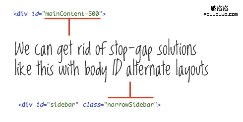 給“<body>”定義獨特的類和ID名稱是非常強大的,不僅僅是為了像上面一樣幫你改變布局,最主要的是有時他能幫你實現頁面中的某一部分達到特殊效果,而又不影響其它頁面的效果。為什麼有這樣的功能,不用我說我想大家都是知道的。因為每個頁面的內容都是“<body>”的後代元素。