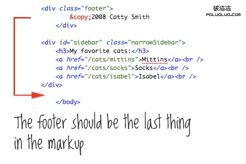 這是一個很少見的錯誤情況,因為我想大家寫頁面都不會把邏輯順序打亂,換句話說,如果可能的話,讓你的網站具有一個先後邏輯順序是最好的,比如說先寫頁頭,在寫頁體,最後寫頁腳。當然有時也會碰到特殊情況,如何頁腳部分在於我們代碼的邊欄以上,這可能是因為它最適合你的網站設計需求,這樣或許是可以理解的,但是如果你有別的方式實現,我們都應該把頁腳是放在一個頁面的最後,然後在通過特定的技術讓它達到你的設計需求: