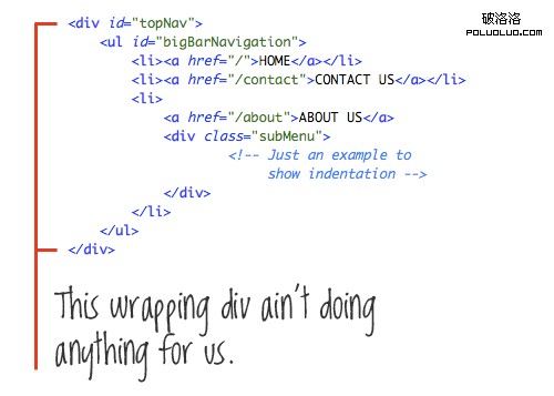 上圖明顯是一個導航菜單的制作,在上圖的實例中:有一個“div#topNav”包住了列表“ul#bigBarNavigation”,而“div”和“ul”列表都是塊元素,加上“div”此處用來包“ul”根本就沒有起到任何作用。雖然“div”的出現給我們制作web頁面帶來了極大的好處,但我們也沒有必要到處這樣的亂用,不知道大家平時有沒有注意這樣的細節呢?我是犯這樣的錯誤,如果你也有過這樣的經歷,那麼從今天開始,從現在開始,我們一起努力來改正這樣的錯誤。