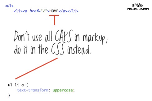 我們在設計菜單時,有時要求所有菜單選項的文本全部大寫,大家平時是不是直接在HTML標簽中就將他們設置成大寫狀態呢?如果是的話,我覺得不好,如果為了將來具有更好的擴展性,我們不應該在HTML就將他們設置為全部大寫,更好的解決方法是通過CSS來實現:
