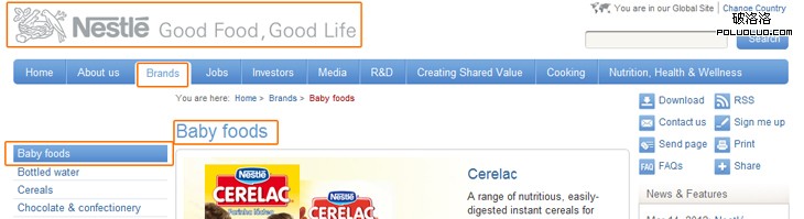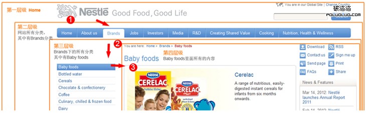 我們用導航原則來檢驗nestle.com的導航設計,這個頁面通過頁面標題“baby foods”告訴我們當前位置,通過網站logo,二級導航欄中選中的“Brands”,左側三級導航欄選中的“Baby foods”,告訴我們這個頁面的固定路徑是從home,選擇brands分類,再選擇Babyfoods。且導航欄的每一個分類都可以被點擊,可以讓用戶返回到上一級。這個頁面完成了導航所需要的所有信息傳達元素。我們也可以明顯地找到頁面中的: