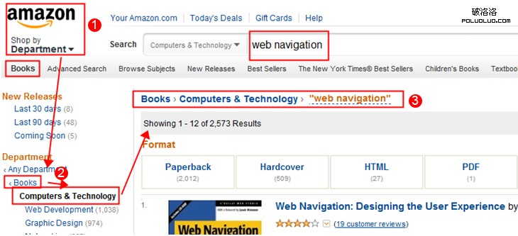 圖6是在amazon浏覽到web navigation的搜索結果頁。圖中將隱藏的頁面路徑和實際存在的面包屑都標示出來了。面包屑的每個節點標簽在頁面的其它導航方式中都有被選中的狀態,且自上而下,從外到內形成包含與被包含的關系,從而形成一個隱藏的頁面路徑。這裡使用的導航方式和前面都不一樣,不止用了導航菜單,還使用了樹形的級聯菜單的方式。當前頁面也不是用頁面標題,而是直接用的實體面包屑的最後一級節點標簽的強化樣式。這個頁面通過不同的方式完成了用戶的導航需求。