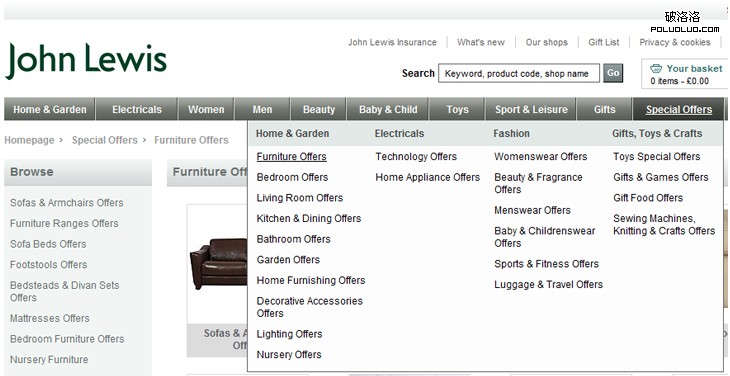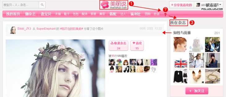Meilishuo的一個雜志內容頁面,沒有實際存在的面包屑,那麼我們尋找其它導航方式,如上圖網站logo、導航欄、頁面標題等,如箭頭所指,我們會發現頁面路徑少了了一段。我們不知道從首頁去了什麼分類,然後來到“所在雜志”。這樣用戶想找雜志所在的上一分類就找不到了,回不到上一級。這個頁面的導航原則就沒有滿足,用戶在此處就會迷失。它主要少了主導航條沒有選中當前所在內容分類,從而讓路徑斷了一節。