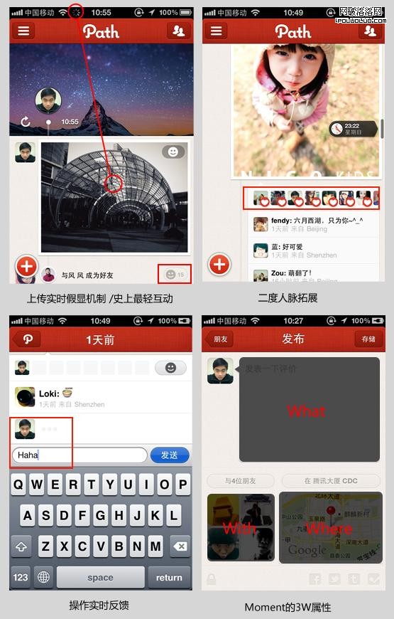 Path對移動設備的Photo有獨到的理解,它認為Photo是我們生活中的一個瞬間(Moment),生活的瞬間不應該是廣播式的分享,應該與最私密的人分享,基於這個理念“私密圈社交”Path誕生了,Path將這一理念貫穿了整個設計,2.0的華麗蛻變引起了設計圈的矚目。