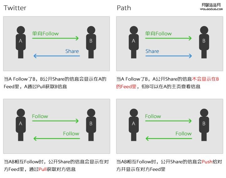 Path華麗的外表已有諸多blog報道分析過,這裡不做贅述,且只從產品與交互層面與大家探討,Path對於單向Follow的關系與Twiiter恰恰相反,當你添加了對方時,意味著你願意與對方分享你的Moment ,而不是訂閱對方的信息,這樣的邏輯更符合私密圈信息分享。