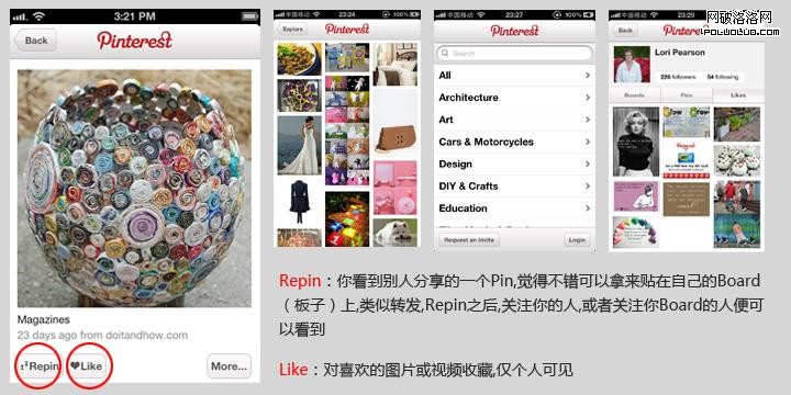 Pinterest瀑布流的呈現方式是他亮點之一,在信息化高速發展的今天,用戶上網的習慣約來約傾向於碎片化時間,快出快進已成為浏覽的常態。瀑布流的信息呈現滿足了用戶隨意式、快速式的浏覽體驗。在互動方式上,Repin的動作較Tweet的動作顯得更加自然。