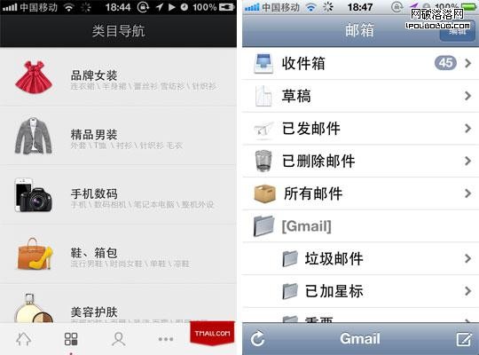 這種類型的導航模式最為常見,它將界面最下方的區域作為導航區,通過tab標簽的形式劃分為3至5個標簽,每個標簽對應不同功能。這種模型適合功能精煉層級較少且需要頻繁切換功能的應用;它的優點在於可以直接將最核心的tab界面最為默認選中狀態,用戶打開應用時便直接呈現出用戶最關心的信息內容,比如社交應用的信息流,郵件應用的收件列表等;同時,用戶可以在大部分頁面中直接切換tab標簽而輕松跳轉頁面,並清晰告訴用戶該應用的主要功能以及當前所在功能;缺點在於tab標簽數量有限,IOS HIG建議不超過5個標簽,如有超過的功能菜單則統一放在“更多”標簽中;同時,該標簽占據50px高度的區域,且在大部分界面中始終存在,占據著10%的信息展現區域。