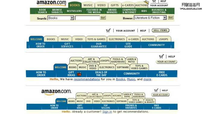 Amazon.com可能是第一個運用tab式導航的大型電子商務網站,Amazon目前線上運用的是垂直菜單+動態菜單的形式。