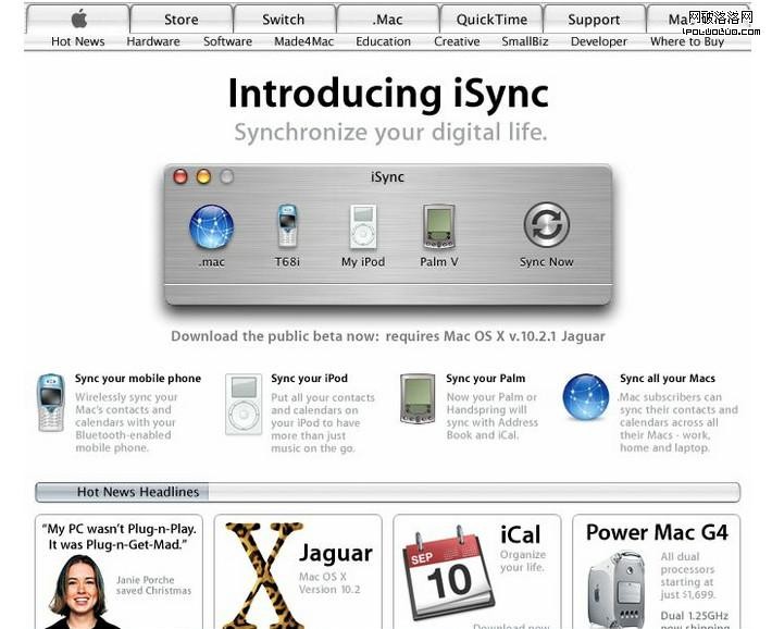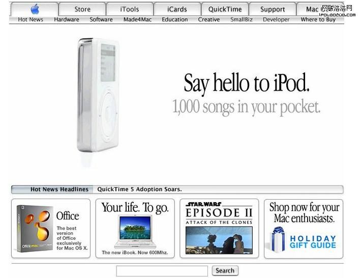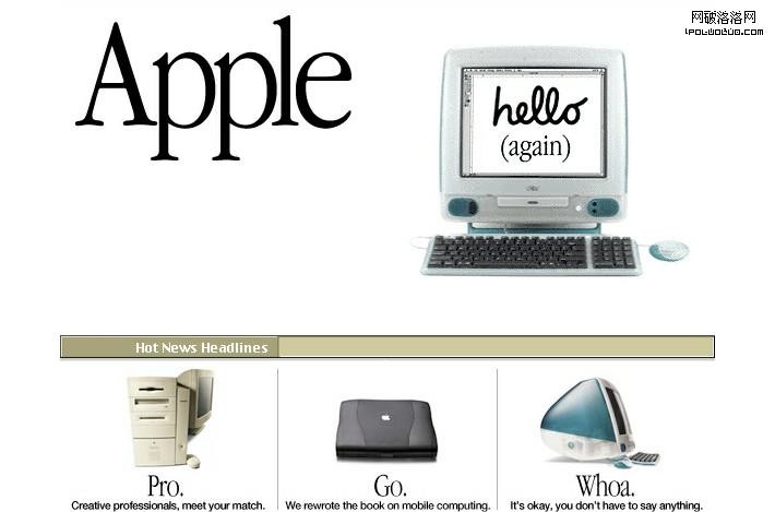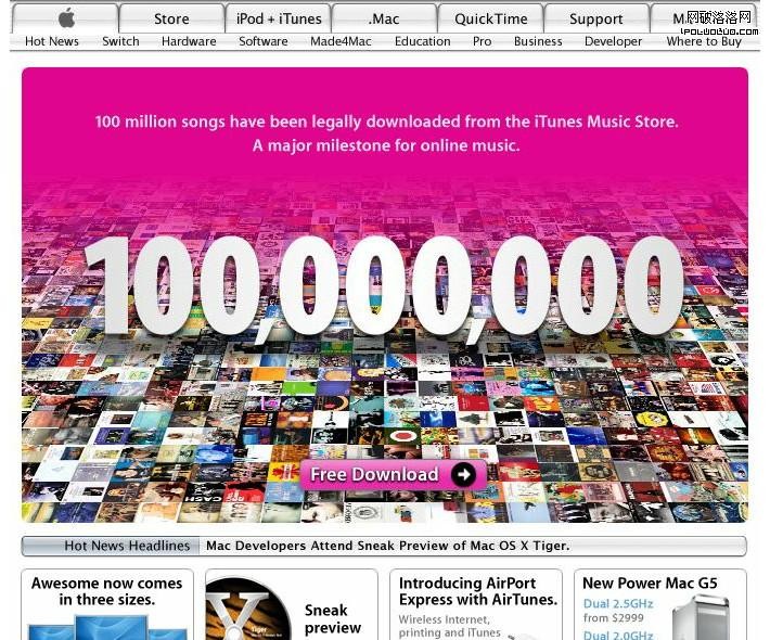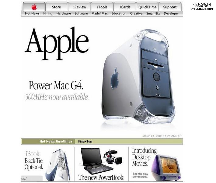已初具apple網站布局的風格。簡潔明了的視覺風格,上下結構,上部大幅產品banner海報+下部三欄形式的產品展示。