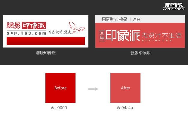 老版的紅色飽和度太高,這種大紅色辨識度太低,品質感也不夠。最終選了飽和度稍低,色相偏粉紅的紅色,搭配大片留白的頁面,新的紅色看起來既女人又清新,到達了上文數據分析的顏色需求。