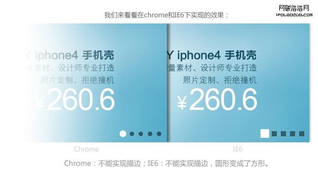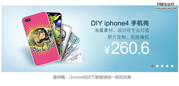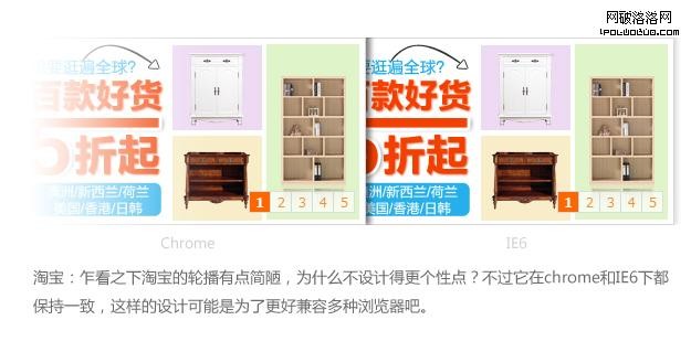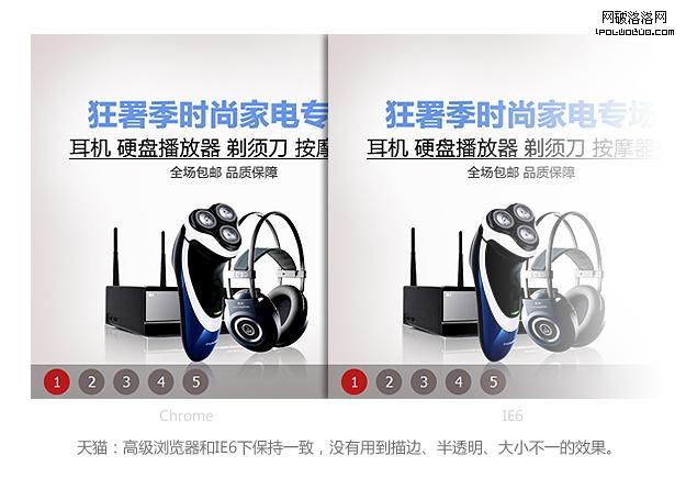 以上是前端工程師GG給我看chrome/IE6浏覽器下的輪播樣式測試效果,發現這2個浏覽器都無法完全支持視覺稿的輪播效果,而且高級浏覽器和IE6下的樣式差異很大,這確實是一件讓人郁悶的事情。頭疼之余,先讓我們看看其他網站的輪播是怎麼兼容多種浏覽器的: