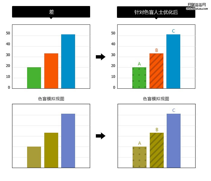 下面以幾種常用信息圖形為例,來說明如何為色盲用戶優化信息圖: