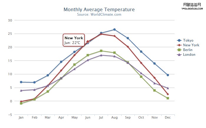 在實際設計過程中,我們不一定會同時使用到以上所有手段,需要在美觀和友好之間進行權衡。我們也可以采用一些交互手段,避免同一界面中元素太多太過雜亂的問題。如highcharts這個趨勢圖非常優秀,它采用了易辨識的顏色,每個節點處都使用了不同形狀的符號,然而僅當鼠標hover到具體節點時,會出現該條線對應的信息(“New York”)。