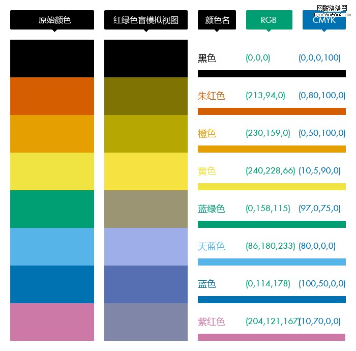 針對色盲人士的顏色識別能力,需要精心選擇配色,才能避免選擇容易混淆的色區。然而,要使配色能覆蓋到各種色覺辨認能力的人(包括色盲、色弱和色覺正常的人群)並不是一件容易的事,尤其同一界面需要出現多種顏色時,讓設計師非常頭疼。日本有研究得出一組無障礙配色建議,在此分享,供大家參考。這組顏色針對色盲和非色盲人士都是易辨識的(例如它選擇了朱紅色代替紅色,藍綠色代替綠色,紫紅色代替紫色,以減少色盲人士的困擾),它對屏顯和印刷都適用,並且所有顏色的名稱也容易定義。