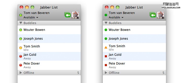 另外除了鼠標hover的交互方式以外,我們甚至也可以為色盲人士提供單獨的色盲模式切換,這樣也可以兼顧視覺上的美觀,避免了太多信息的干擾。這種形式在游戲和軟件中也有先例。例如iChat,一般情況下僅有不同顏色來區別用戶的在線狀態,但同時,它也提供了“User shapes to indicate status”選項,可以將“空閒”狀態換成橙黃色三角形符號,將“忙”狀態換成紅色方形符號表示。