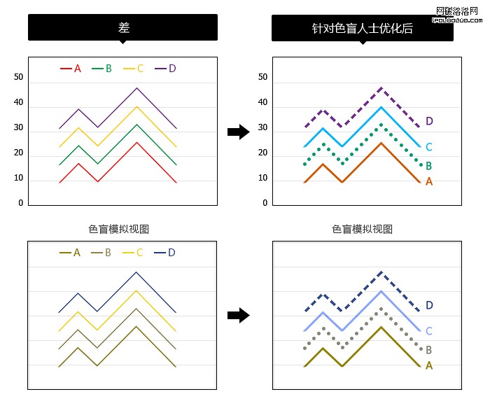 優化采用了這樣一些手段:A.采用更粗的線條,使顏色更明顯。(色塊越小,顏色越難分辨。對有色覺障礙的人來說,帶顏色的細線、小圖標、細體文字尤其難區分。)B.換用不同形狀的線條(實線、虛線、點線)。C.文字直接注釋在線的周圍。D.顏色微調。這樣對每一類數據使用多重可視化變量進行編碼後,即便顏色信息完全丟失,也能夠完整的傳遞信息。所有使用線元素的信息圖,都可以參考這種解決方式。