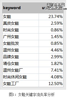 圖1是用戶輸入“女鞋”相關的關鍵字及相應的UV流失率(即沒有在搜索頁進行過任何操作行為的用戶數占所有搜索用戶的比例),從數據上看添加了真皮、廣州、時尚等屬性詞的關鍵字流失率相對低很多。