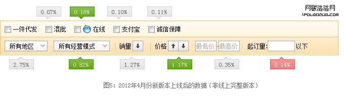 各篩選項應該放在哪裡更合適,很大程度上取決於用戶在查找產品的時候,更關注哪些維度的信息。對於已經上線的功能,我們可以通過數據進行分析,如上圖是篩選區的CTR數據,可以發現用戶使用地區、排序、單價、經營模式操作較多,說明用戶對這方面篩選需求較大,也較關注這幾個維度的信息,以此可以將篩選項調整到方便用戶查找的位置,也降低了用戶的記憶負擔,因用戶一般都是從左到右浏覽,所以可以將重要的篩選調整到首位或是用視覺突出。而一些數據較低的篩選,可以根據情況隱藏或是下線,也增加篩選區的擴展性。