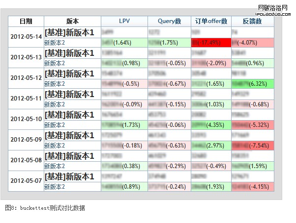 通過bucktest可以得到如圖8的對比數據,紅色為數據下滑,綠色為數據上漲。
