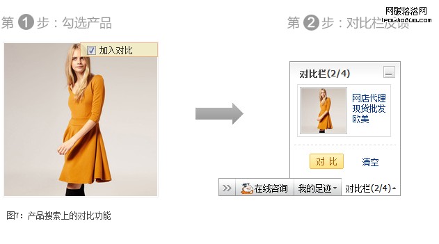 同時,我們來看一個不合理的產品設計(見圖7)。圖上是阿裡巴巴在去年上的對比功能,用戶勾選產品加入對比(圖7第1步)只占整個搜索CTR0.6%左右,而到最後點擊了對比按鈕(圖7第2步)的轉化率只有其中的10%不到,對比功能的使用率很低。
